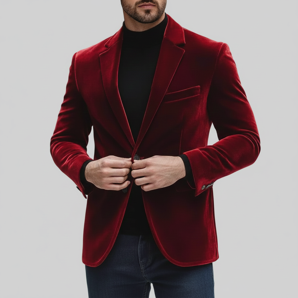 Men's Evening Blue Notch Lapel One Button Long Sleeve Velvet Blazer