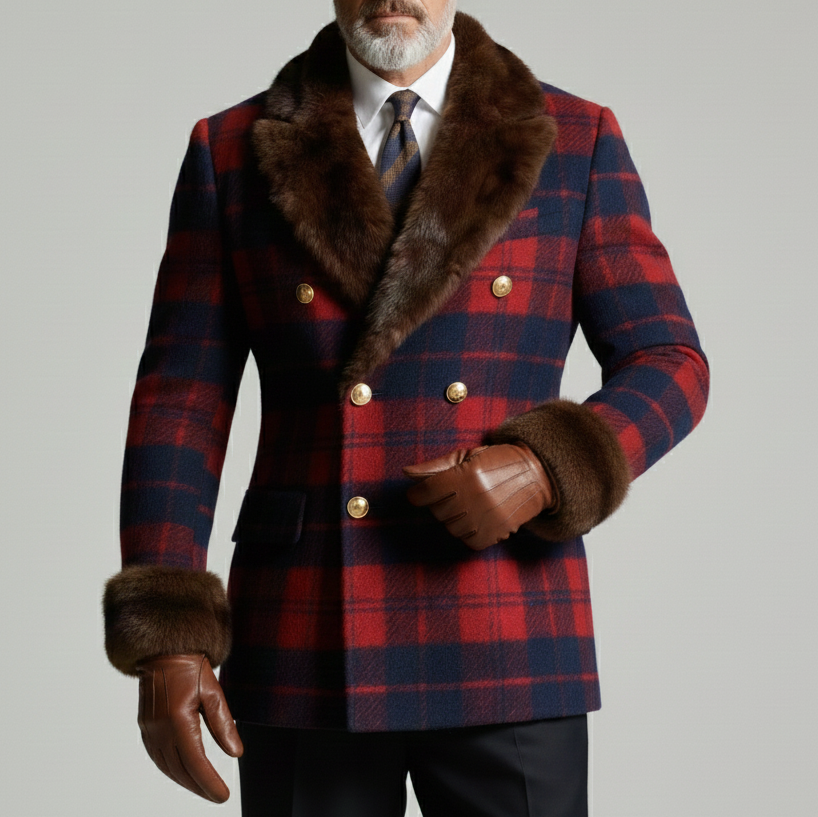 Men's Red Plaid Print Fur Patchwork Lapel Collar Long Sleeve Double Breasted Blazers