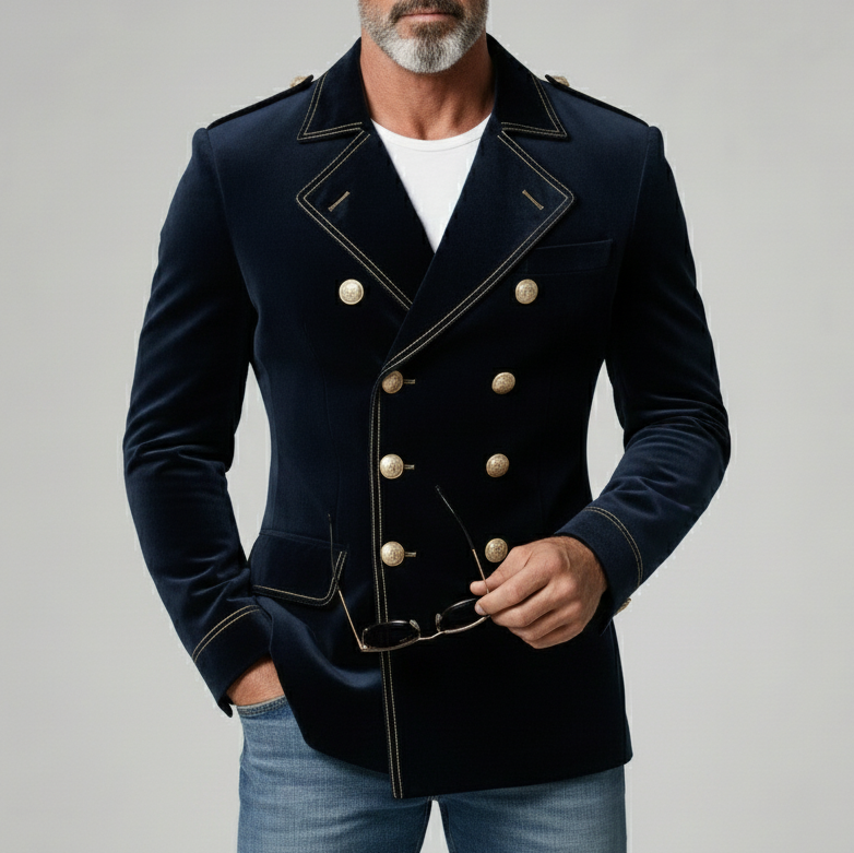 Men's Business Casual Navy Blue Velvet Notched Lapel Double Breasted Long Sleeve Blazers