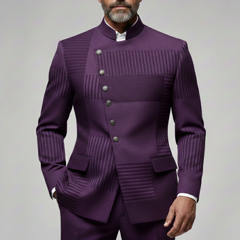 [Pre-Order] Men's Business Grape Geometric Colorblock Stand Collar Asymmetrical Single Breasted Long Sleeve Blazer
