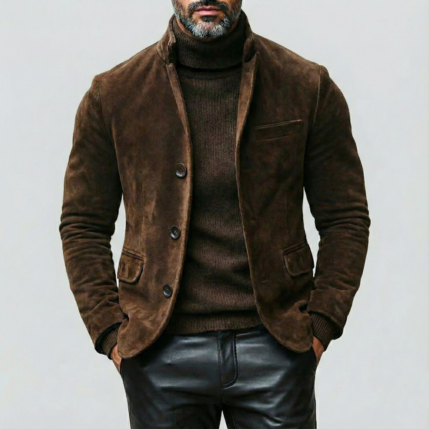Men's Retro Dark Brown Stand Collar Long Sleeve Chest Pocket Single Breasted Suede Blazers