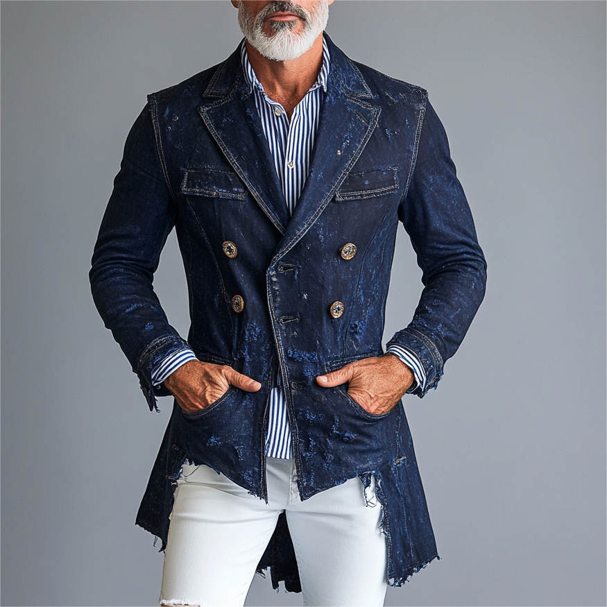 Men's Notched Lapel Two Button Ripped Denim Blazer