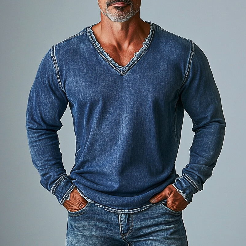 Men's Casual Raw Edge Denim V Neck Long Sleeve Sweatshirt