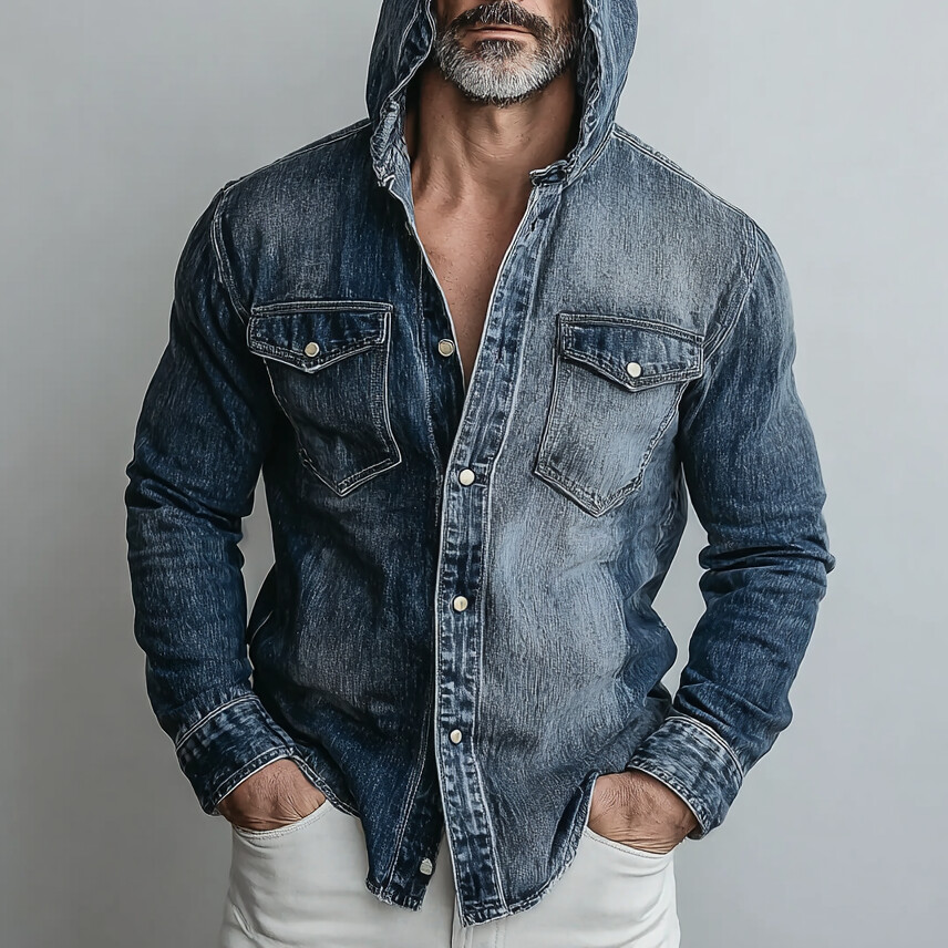 Men's Casual Denim Raw Edge Pocket Long Sleeve Drawstring Hoodie