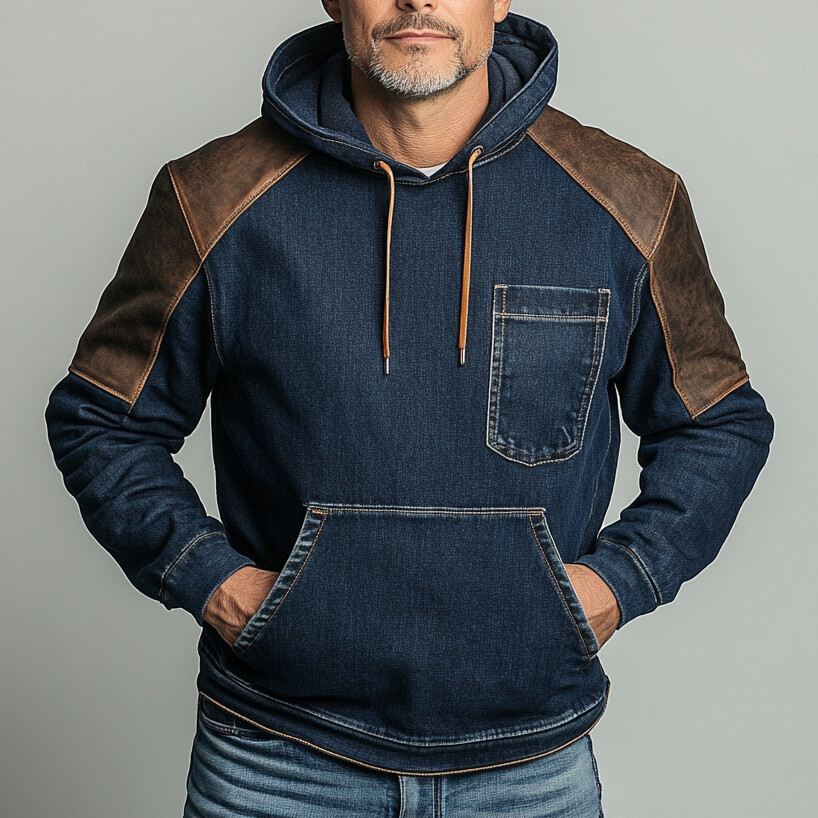 Men's Denim Patchwork Long Sleeve Pocket Drawstring Hoodie