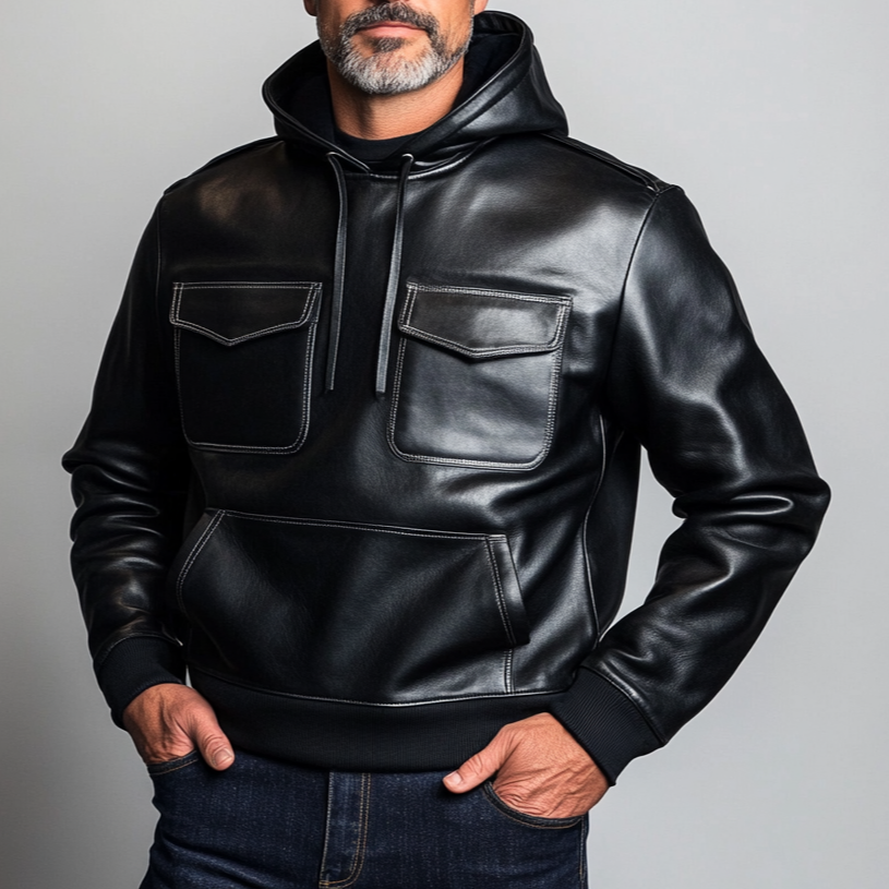 Men's Solid Long Sleeve Flap Pocket Drawstring PU Leather Hoodie
