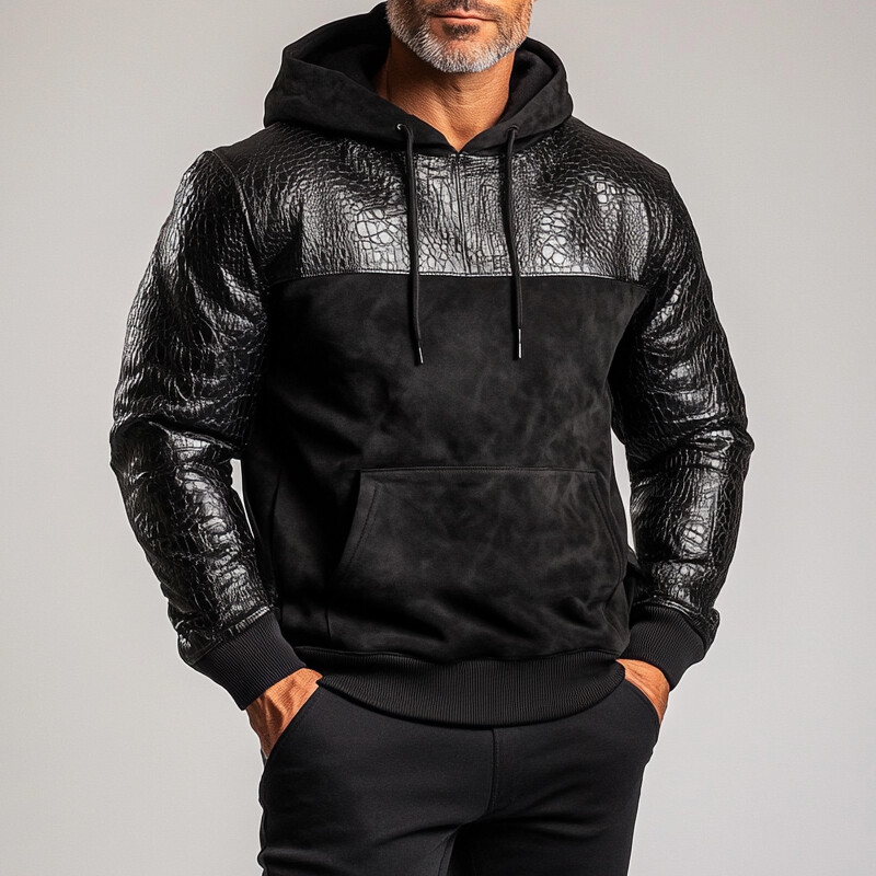 Men's PU Leather Crocodile Pattern Patchwork Suede Pocket Hoodie
