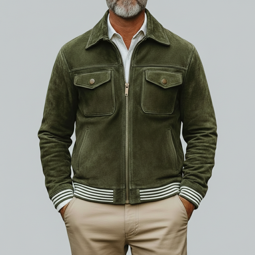 Men's Retro Army Green Suede Shirt Collar Long Sleeve Flap Pocket Striped Zipper Jackets