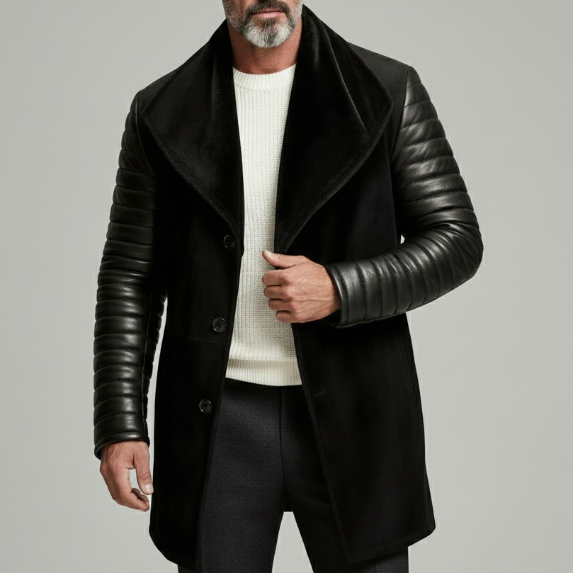 Men's Business Casual Black Quilted PU Leather Patchwork Suede Lapel Collar Single Breasted Jackets