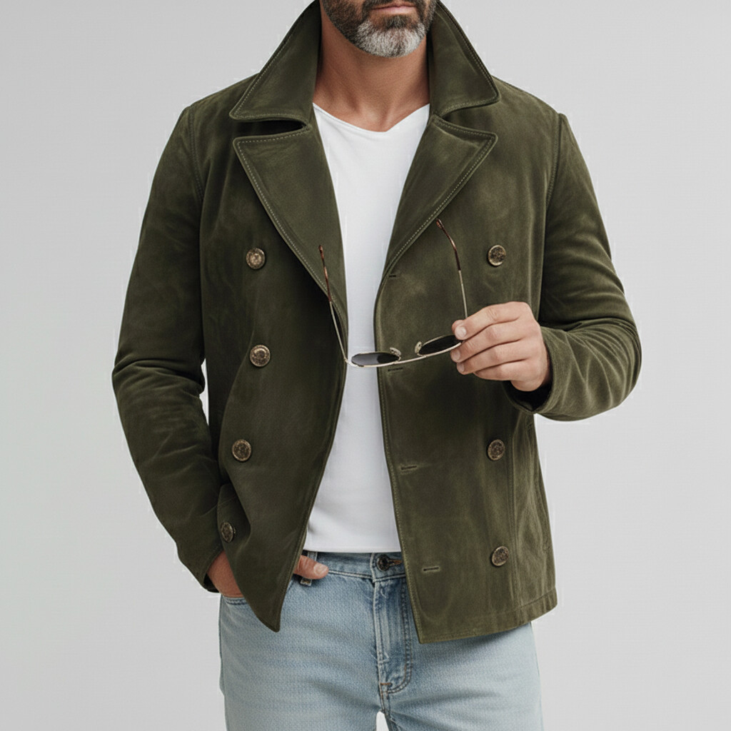 Men's Retro Army Green Suede Solid Lapel Collar Double Breasted Long Sleeve Jackets