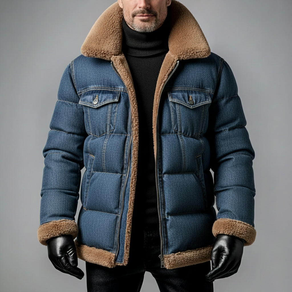 Men's Blue Shearling-Lined Turndown Collar Long Sleeve Utility Pockets Zipper Denim Puffer Jackets
